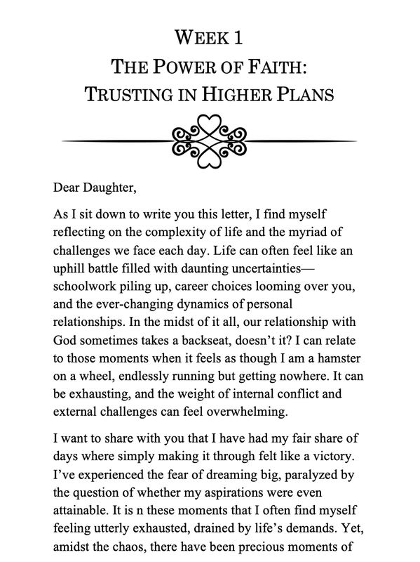 This book is structured with a chapter to be read for each week of the year—52 chapters for 52 weeks. This book will serve as a companion on your journey, with each chapter reflecting a life theme that is essential for every woman. Within these chapters, you will find a personal letter directed to you, a scripture to inspire and uplift, and a prayer to guide and cover your journey.
